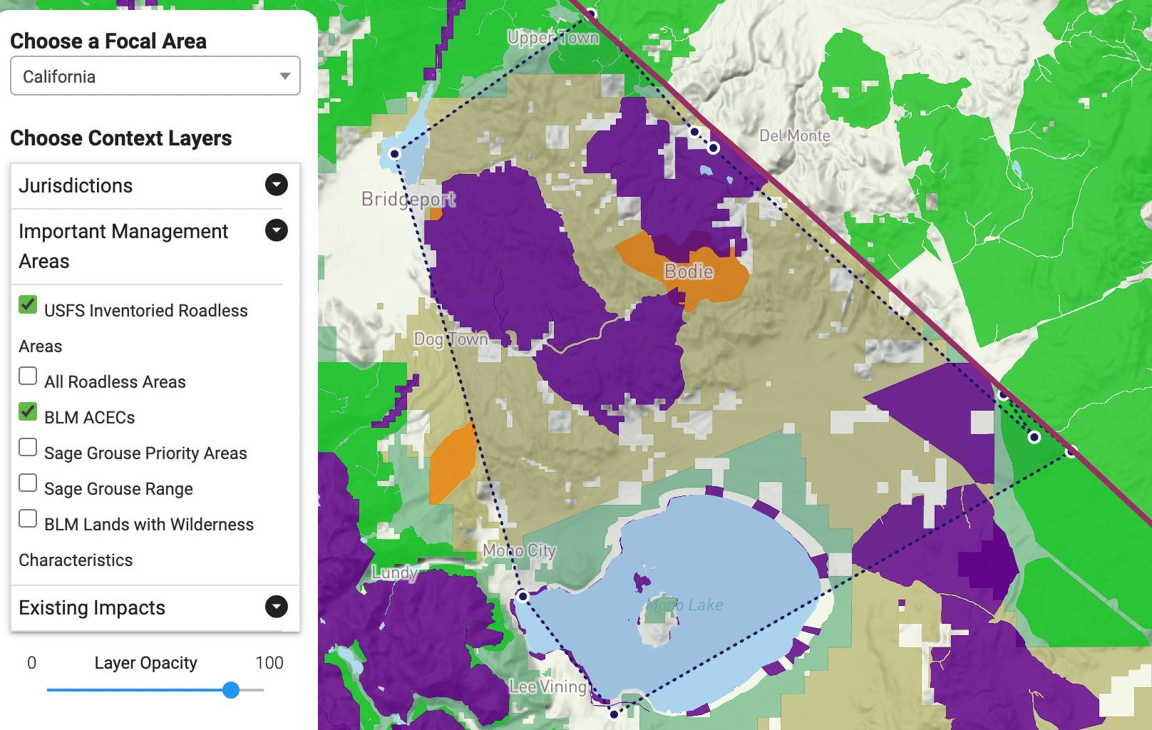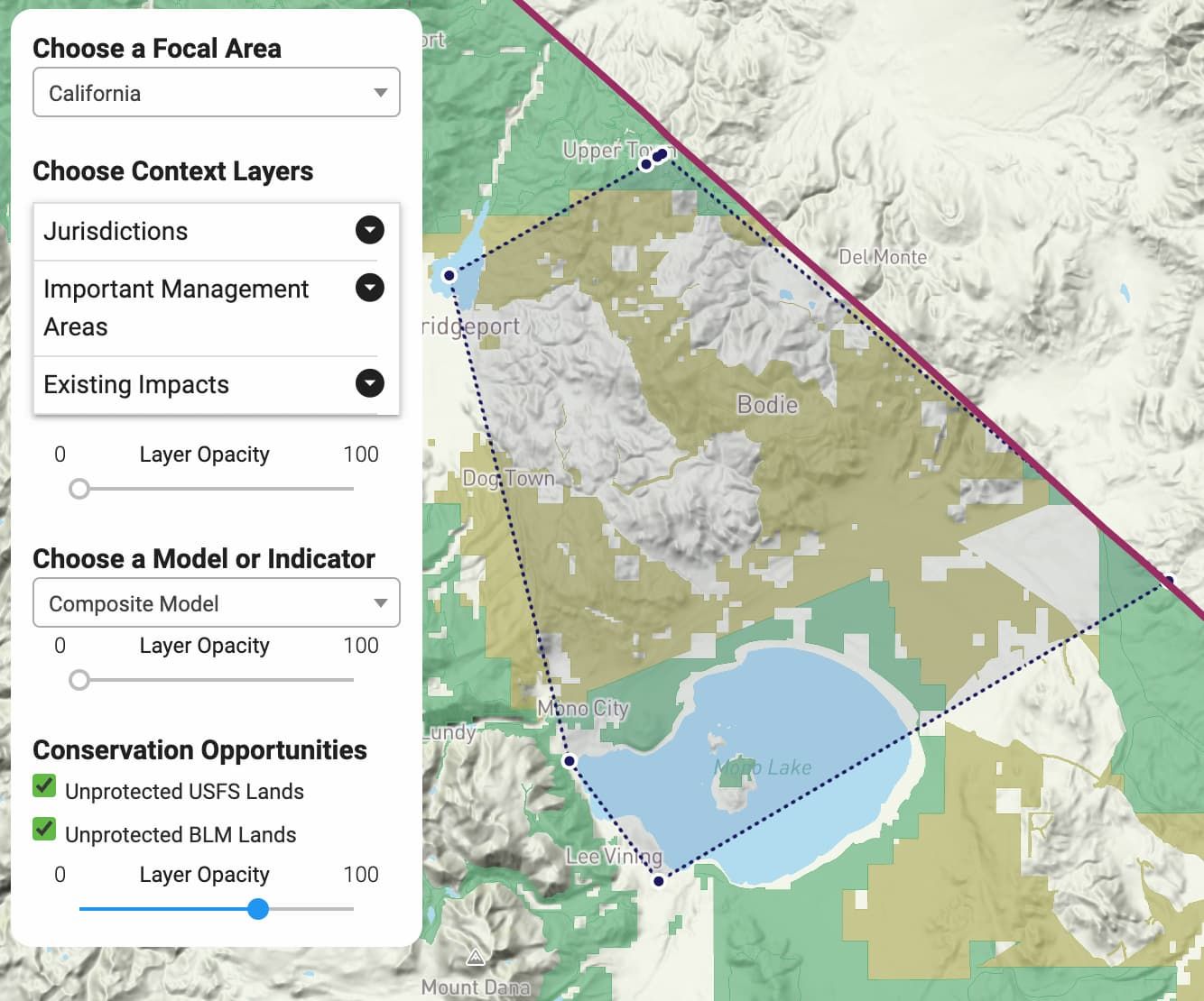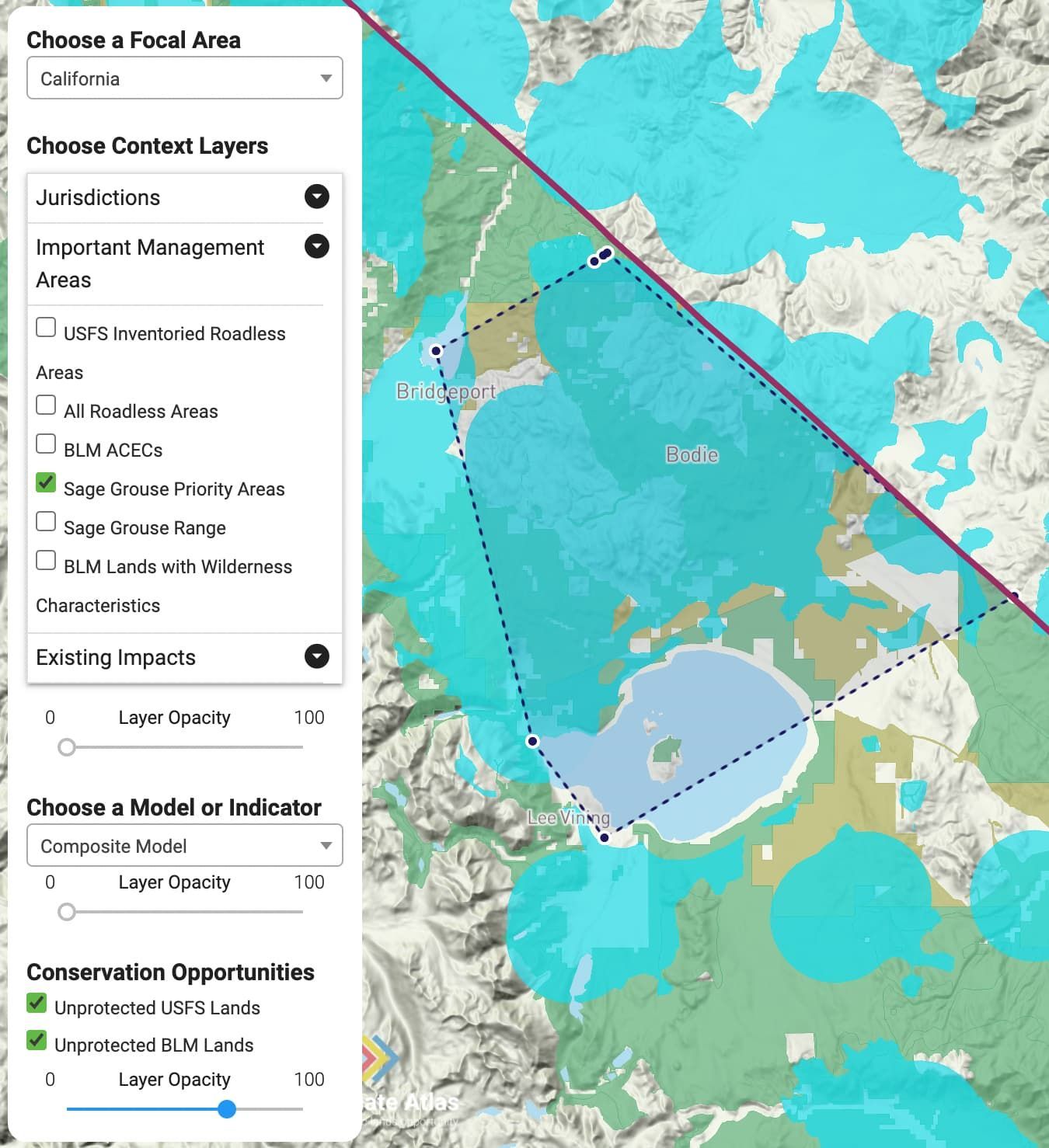 Snapshot of Climate Atlas showing “California” and a rough outline of the Bodie Hills area (dotted black), plus the layer “Unprotected BLM Lands” (beige). The Bodie Hills area was outlined using the polygon tool at the lower right of the app.