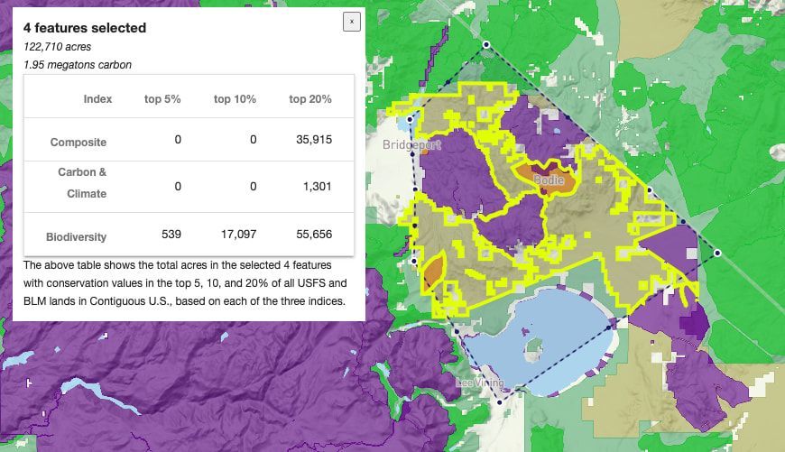 Snapshot of Climate Atlas showing “California” and a rough outline of the Bodie Hills area (dotted black), plus the layers “Protected Lands” (purple), “Unprotected BLM Lands” (beige), “BLM ACECs” (orange), and “USFS Inventoried Roadless Areas” (bright green). The box showing the total acreage and carbon for the four parcels, plus the combined model results, was obtained by holding down “Shift” and then clicking on each parcel in turn (yellow outline).
