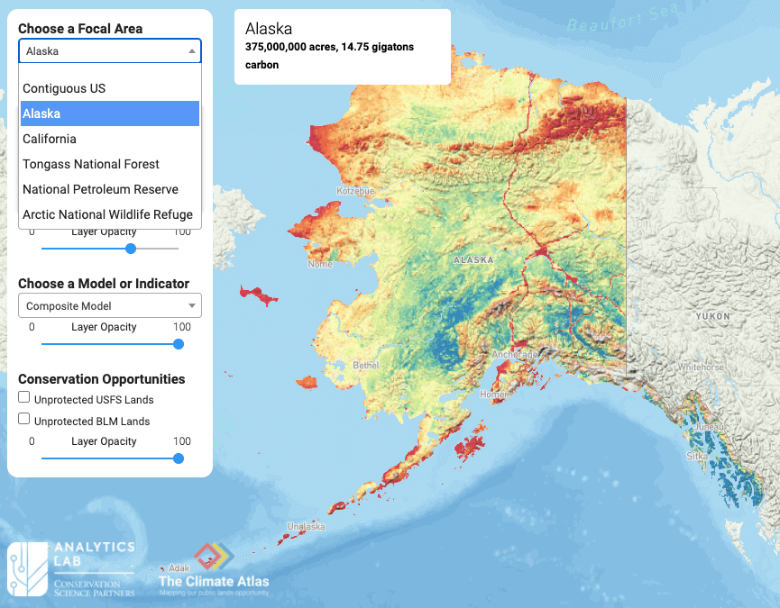 The data provided in The Climate Atlas are intended to be used to inform the identification and prioritization of high-value public lands in the lower 48 U.S. states and Alaska. Through the tool, users can identify the top areas required to achieve their particular targets, in terms of acreage or percent of land area protected.