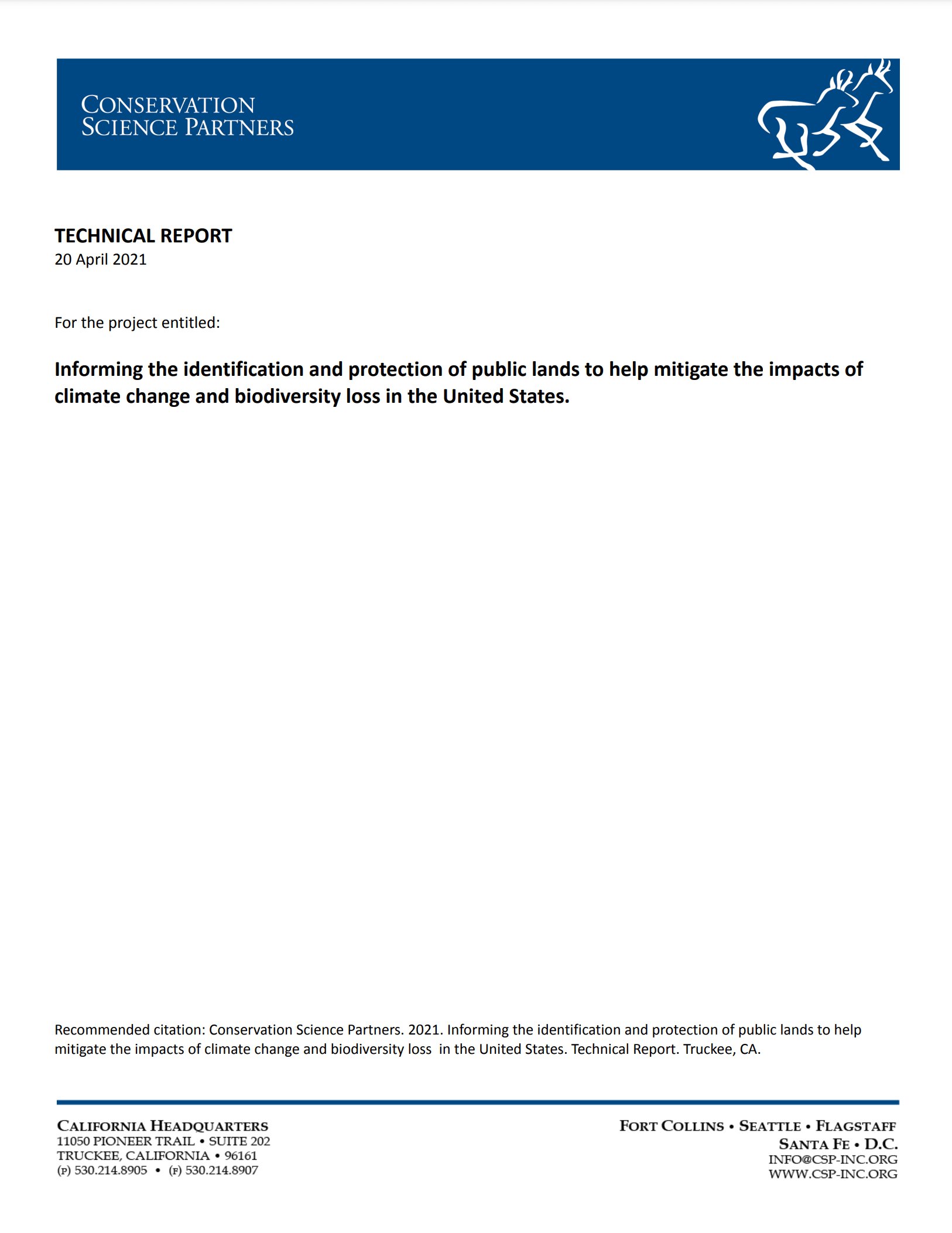 Recommended Citation: Conservation Science Partners. 2021. Informing the identification and protection of public lands to help mitigate the impacts of climate change and biodiversity loss in the United States. Technical Report. Truckee, CA.